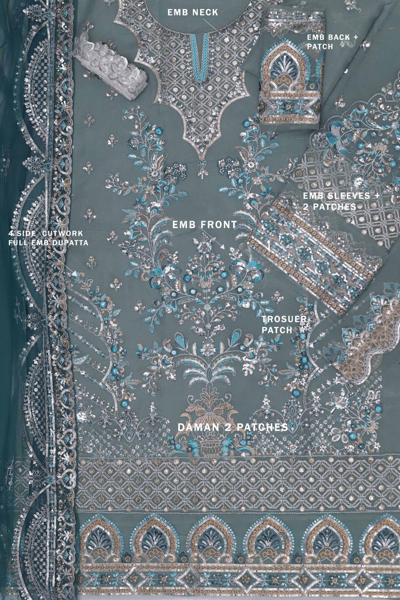 Elegant Ready-to-Wear Dupatta: The set comes with a ready-to-wear net dupatta adorned with embroidered sequins cutwork, offering a luxurious finish. Its lightweight yet grand appearance complements the outfit and adds a touch of sophistication.